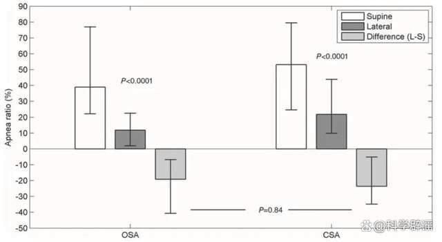 参考资料 [4]:以阻塞性睡眠呼吸暂停(OSA)和以中枢性睡眠呼吸暂停(CSA)为主的患者在仰卧位(空心柱)和侧卧位(深色柱)时的呼吸暂停比率(AR)。浅色柱代表侧卧位与仰卧位之间的差异。