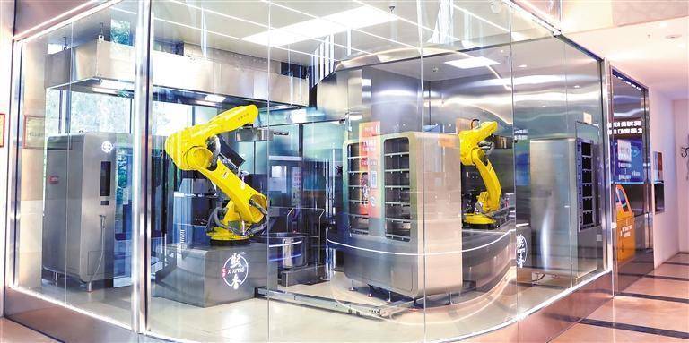 8月13日,在上海熙香智厨机器人有限公司AI食堂,机器人在烹饪餐品。熙香科技将人工智能运用到餐饮领域,自主研发的全流程无人化厨房技术已应用到多地的食堂、餐厅。 邓雅丹摄 (中经视觉)